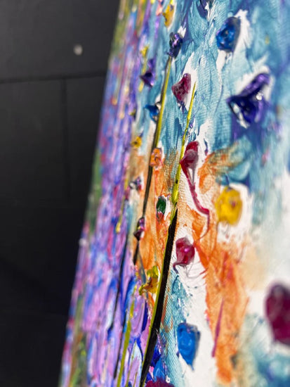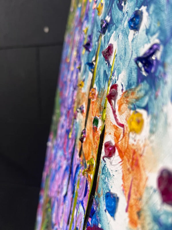 A juxtaposition of the joy of blooms, the bursts of colour in the seasons alongside the unfinished evolution of nature, that travels in its own direction. The momentum of the paint stops the drips as the energy recesses.