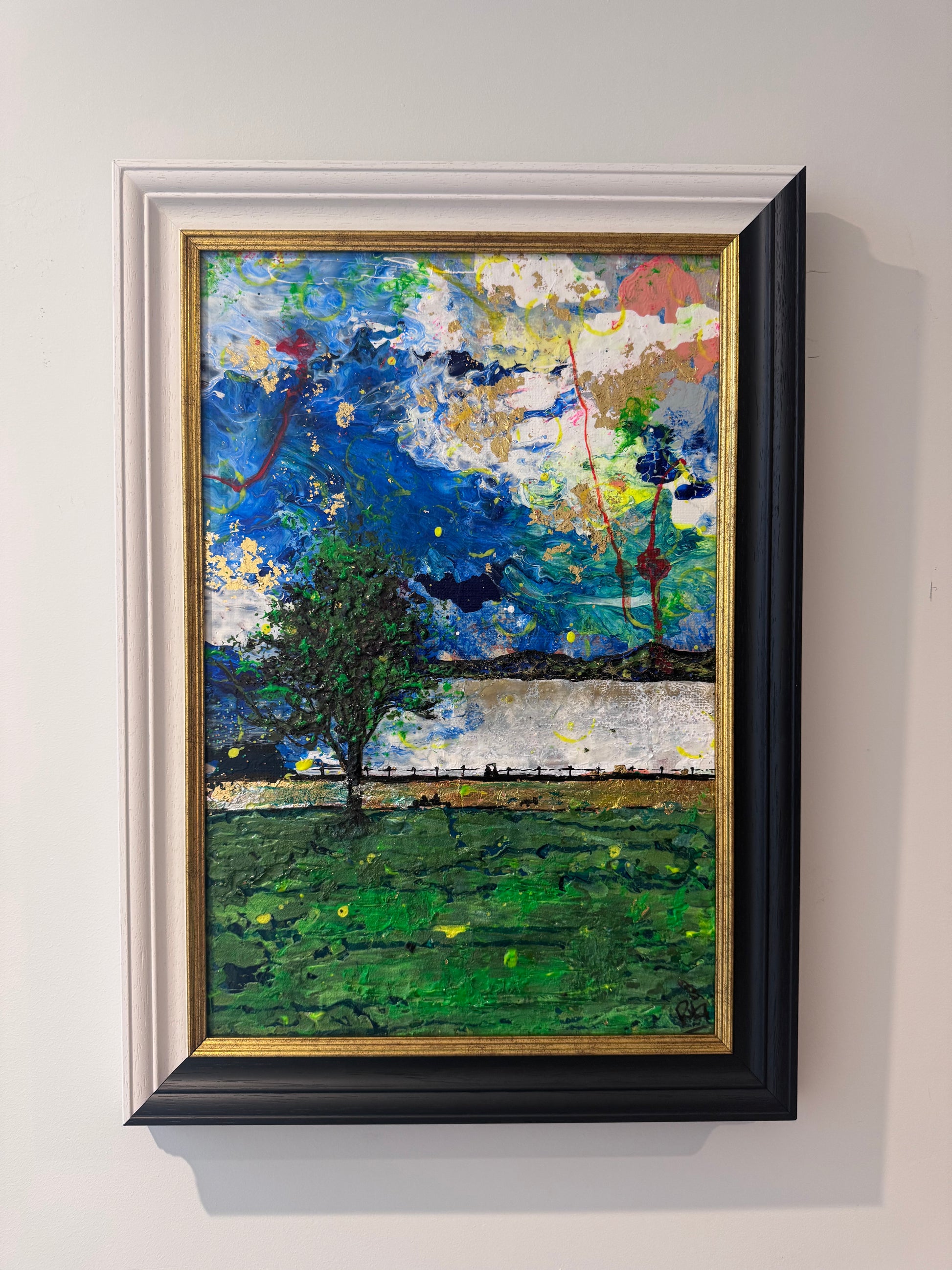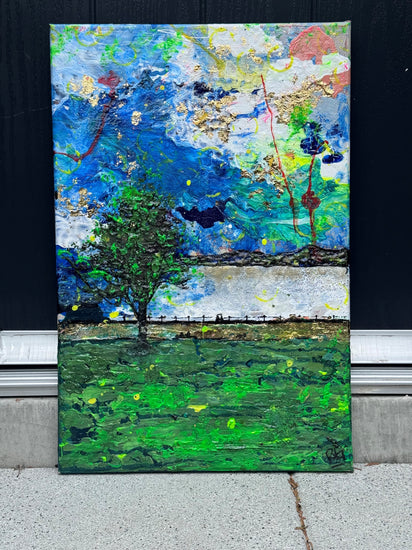 - Acrylic, pouring acrylics, pewter and gold leaf, mixed medium
