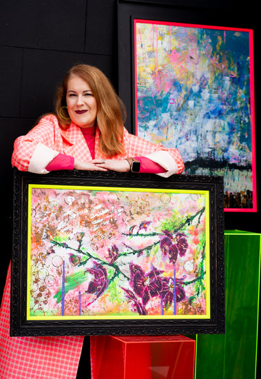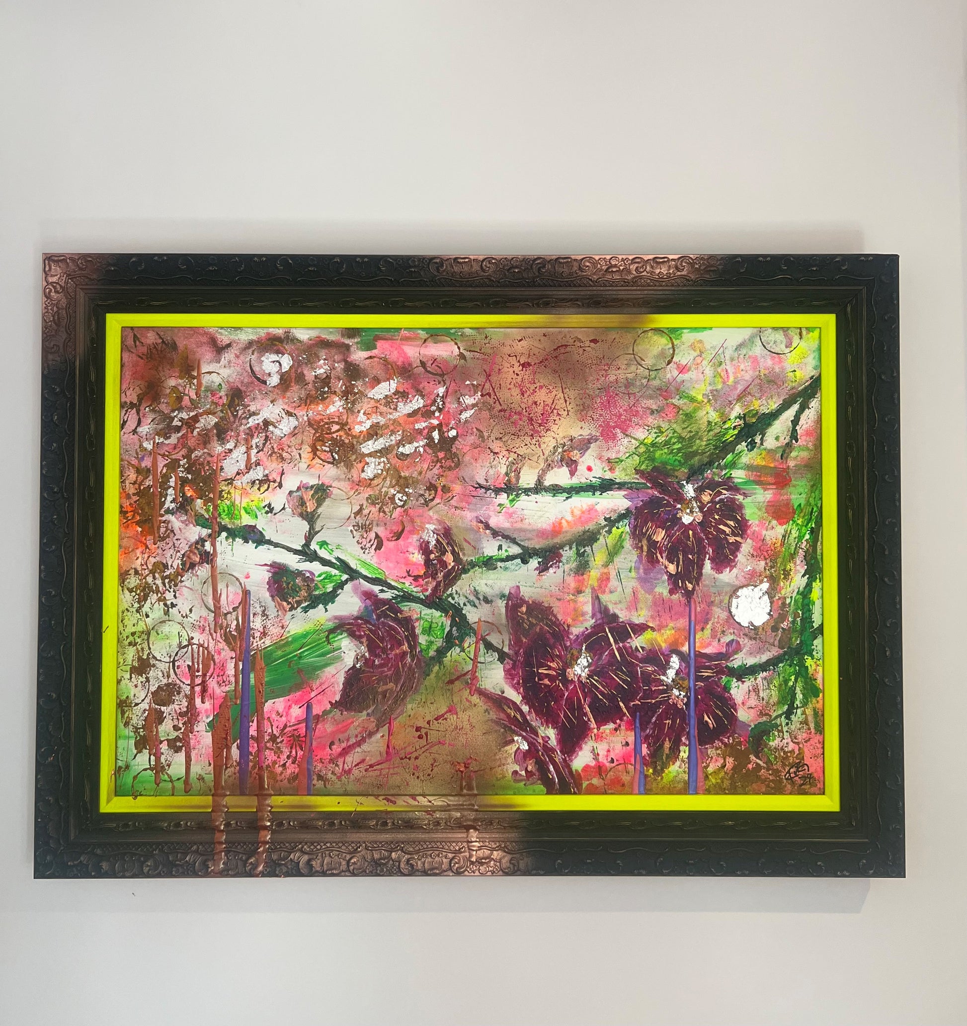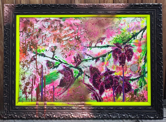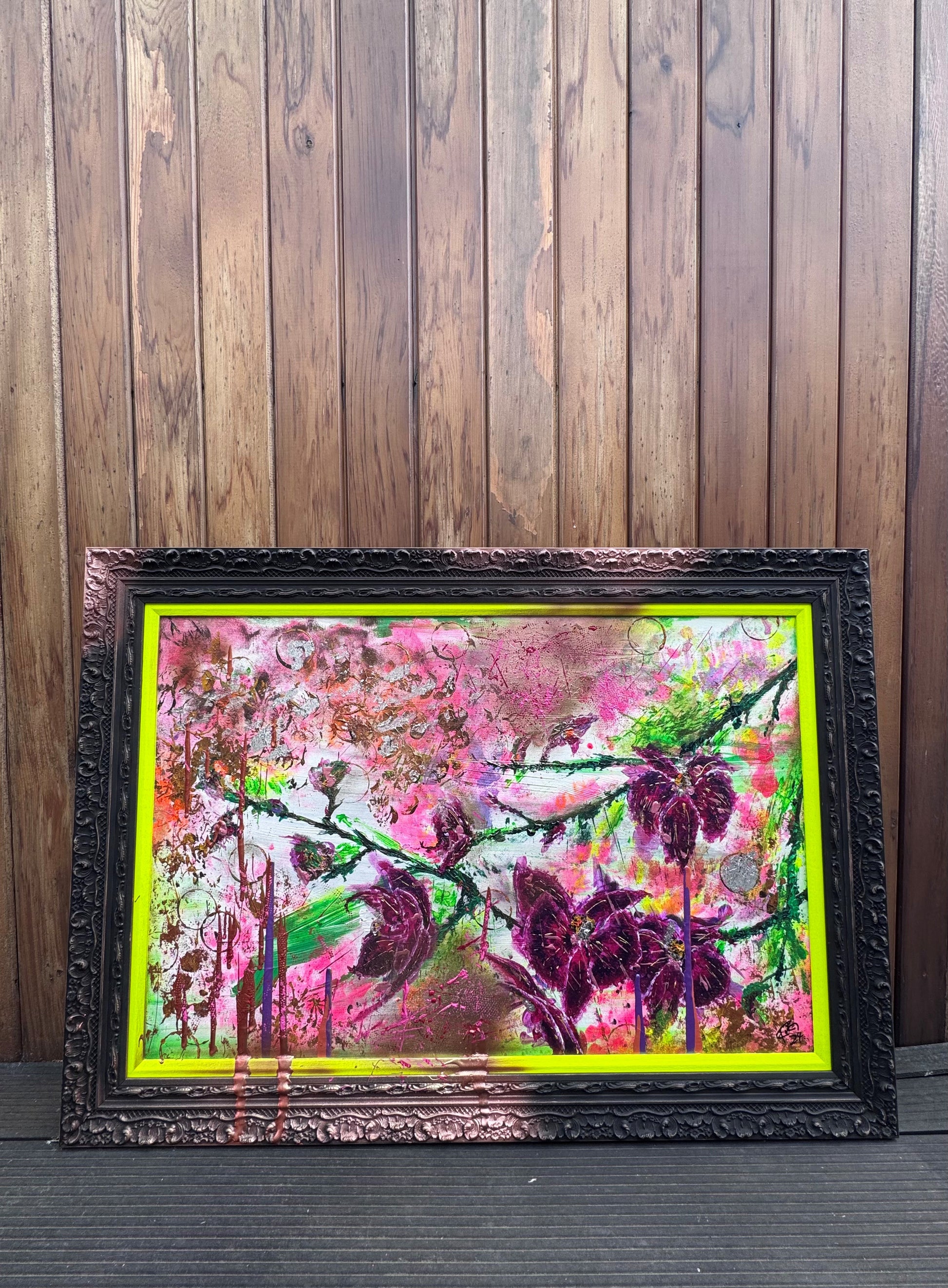 You can see how there are abstract orchids that really jump out of the canvas. The pièce de résistance is the frame. To me, a piece is final when it's framed. That's the full package. The neon yellow is a stark juxtaposition against the deep purple, and then we have this very embellished black frame to set it all off. I love this piece.