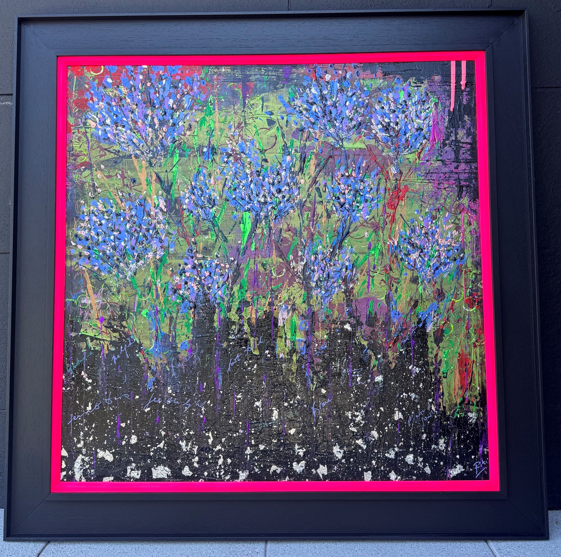 Unlike many of my paintings, I started this painting when, to be honest, I just wasn't feeling great. So I started with the background colour, and like many of my other works, I started to write words. I'd had a particularly challenging week in work, it was the weekend but my mind was still consumed by work challenges, and I just really needed to get it out. So I started off by writing some of the words on the painting that I felt.