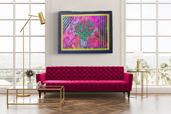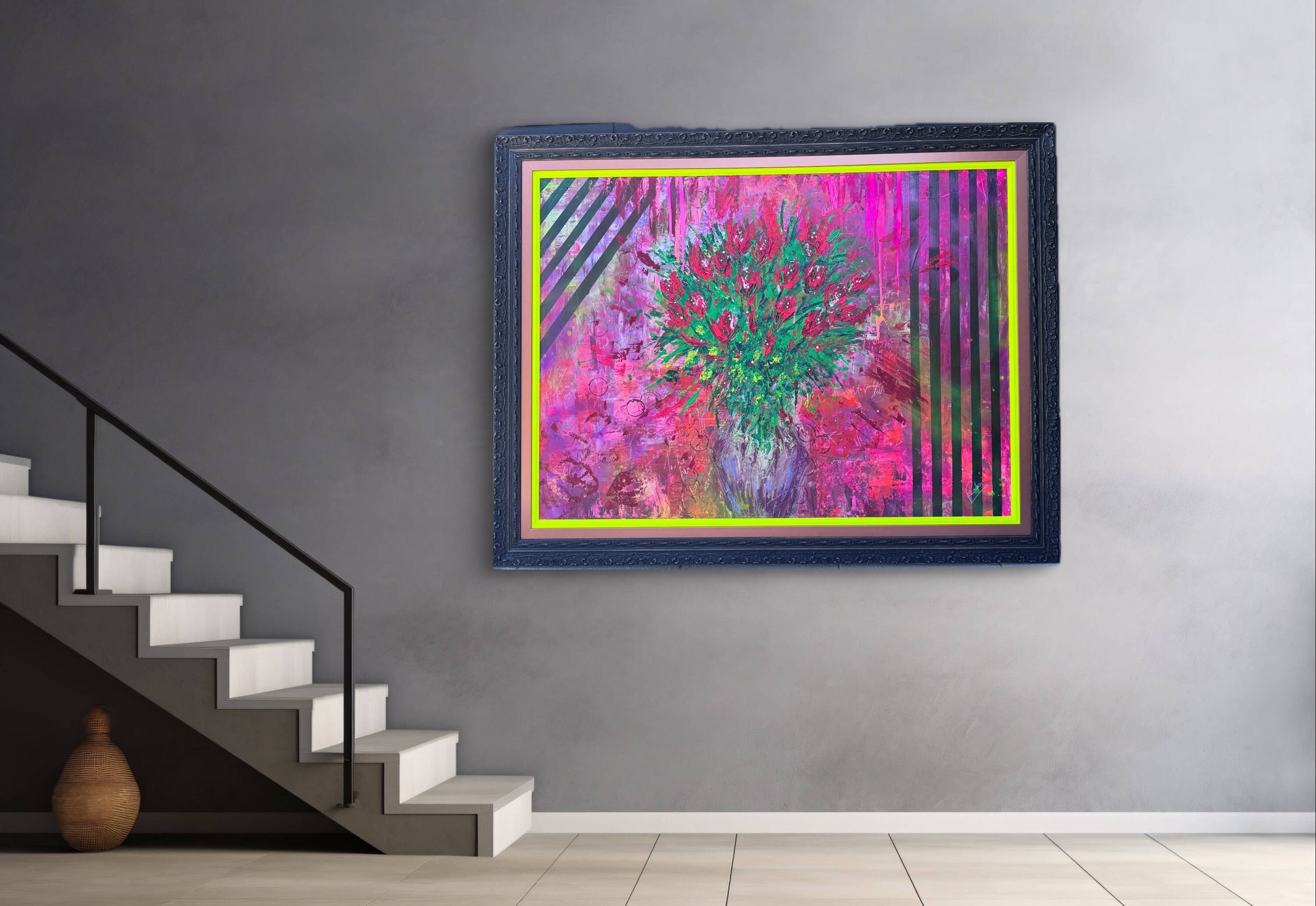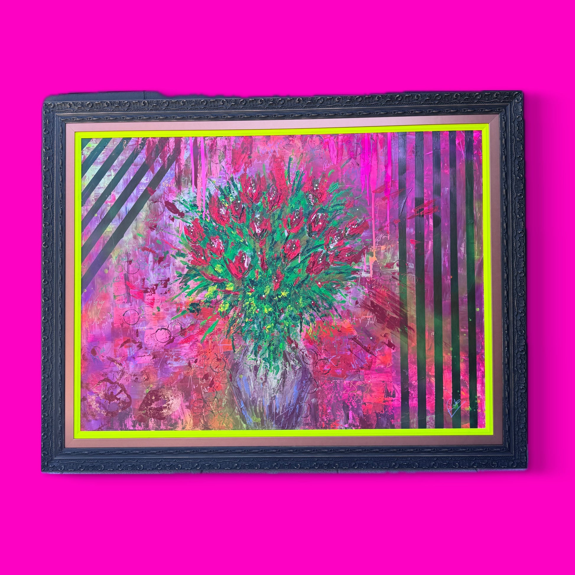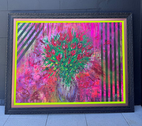 Kiss from a Rose. This is potentially my favourite piece. I love this piece. I think it's the combination of roses, the subtlety of the vase, the background of the deep reds, purples and pinks, and the juxtaposition of the black stripes. The black stripes is a new experiential type style that I was trying out, and I absolutely love it - how the angular stripes give a frame and shape to the loose nature of the flowers coming into bloom.